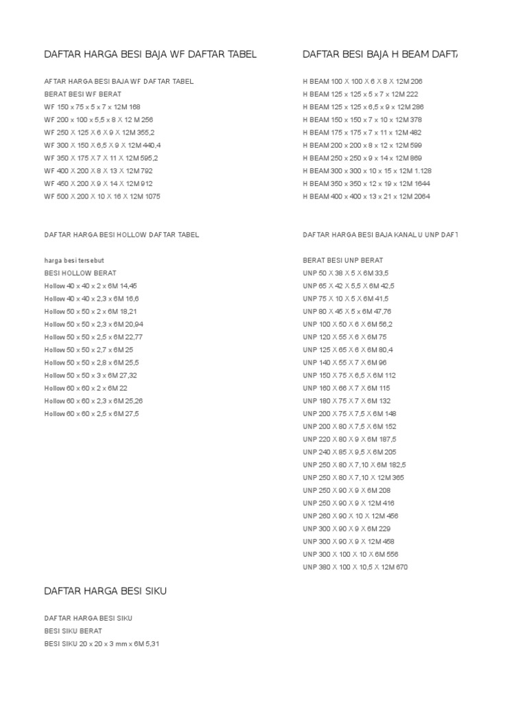 Daftar Harga Besi Baja Kanal U Unp Daftar Tabel